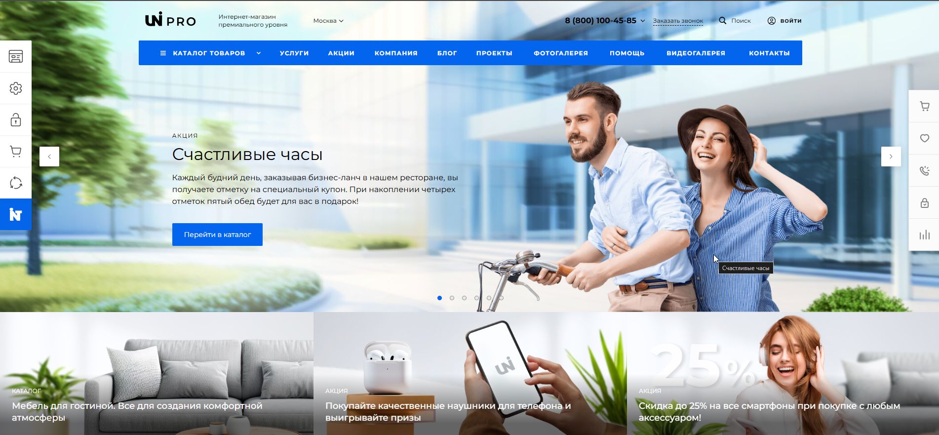 Мы очень тщательно проработали наше готовое решение, основываясь на маркетинговых исследованиях, поэтому сайт с самого начала «заточен» на продажи и учитывает последние дизайнерские тенденции.